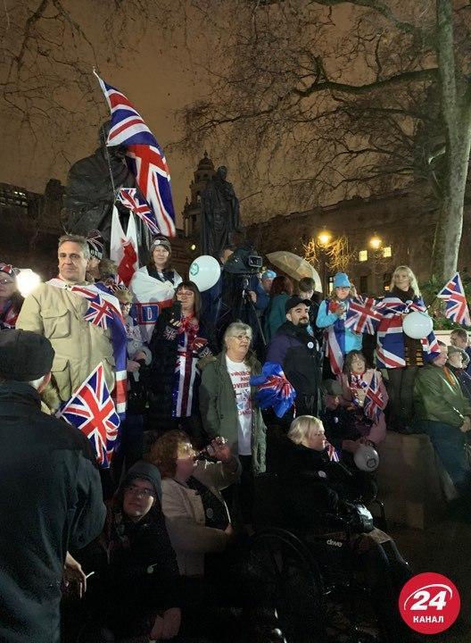 В сети также показали, как празднуют обычные подданые на улицах Лондона: с танцами и веселыми плакатами. Появилось также забавное видео "ухода Британии" под звуки волынки. На Парламентской площади собрались сотни людей с флагами и значками Happy Brexit Day.
