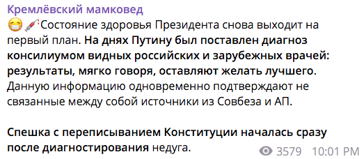 В Кремле спешат с внесением изменений в Конституцию из-за проблем президента РФ Владимира Путина со здоровьем. Об этом написал влиятельный российский Telegram-канал "Кремлеский мамковед" со ссылкой на несвязанных между собой источников в Совбезе и администрации президента.