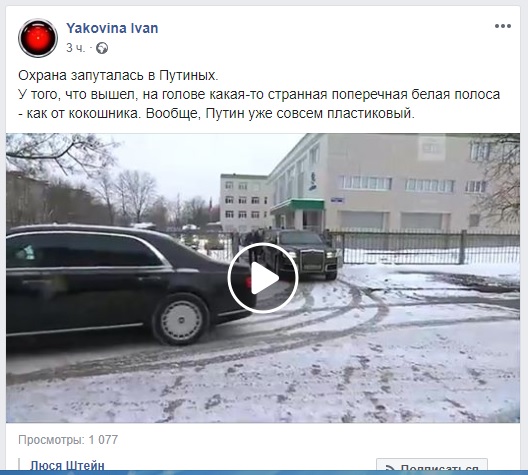 "Охрана запуталась в Путиных. У того, что вышел, на голове какая-то странная поперечная белая полоса - как от кокошника. Вообще, Путин уже совсем пластиковый", - написал Яковина, намекая на то, что власти РФ для перестраховки используют двойников Путина, оттого и получаются такие курьезы.