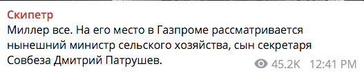 "Миллер все. На его место в Газпроме рассматривается нынешний министр сельского хозяйства, сын секретаря Совбеза Дмитрий Патрушев", - поделился информацией ресурс.