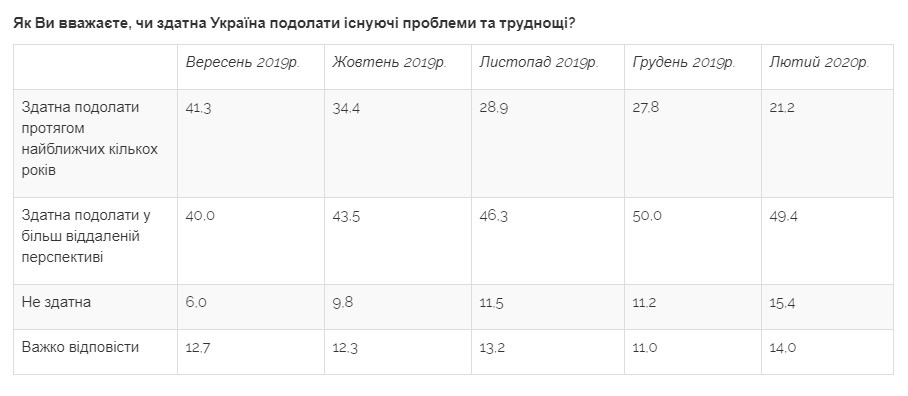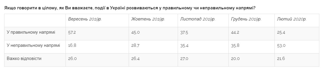 Процент оптимистично настроенных граждан сильно снизился по сравнению с предыдущими месяцами. Еще в сентябре 2019 года 57,2% украинцев считали, что страна движется по правильному курсу и лишь 16,8% были иного мнения. С каждым месяцем процент довольных уменьшался.
