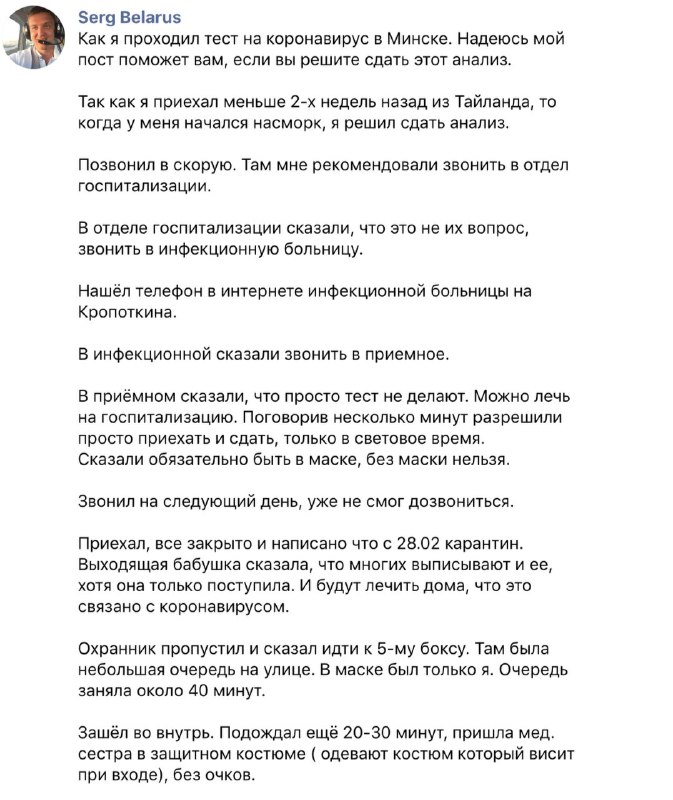 А в Telegram-канале "Беларусь головного мозга" опубликовали пост мужчины, который прилетел в Минск из Тайланда и для своей же безопасности сам решил сдать анализ на коронавирус. Однако далее начались "приключения".