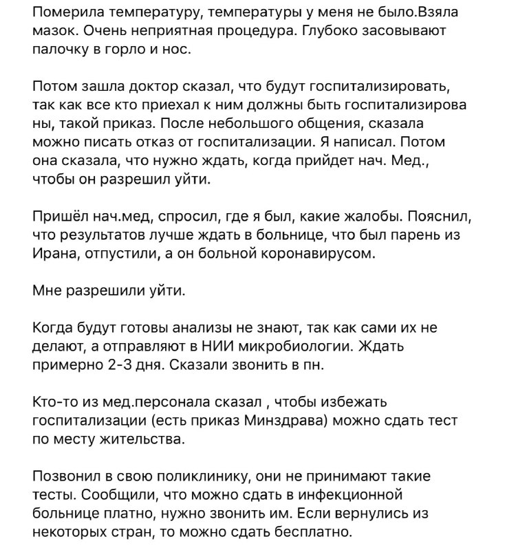 "Ребята, вы пока не знаете, что происходит. Я тоже не знаю, потому что тут мне никто ничего не говорит. Со вчерашнего дня (27 февраля) до сих пор кучу анализов сдал, но пока ответа нет. И вчера я пошел в больницу (в поликлинику) делать анализы. Там мне сказали, что могу ехать домой. Я поехал. Ночью приехали за мной, забрали не только меня, а и жену, и ее родителей. Я не знаю, что сказать и что делать. Был бы коронавирус у меня (видимо, есть) я бы не чувствовал себя так хорошо. Я отлично себя чувствую. Температура 37,4. Это из-за того что моя жена еще до моего прилета, была простывшая. Я прилетел, мы были вместе, и я тоже простыл...", - написал он на своей странице в соцсети "ВКонтакте":
