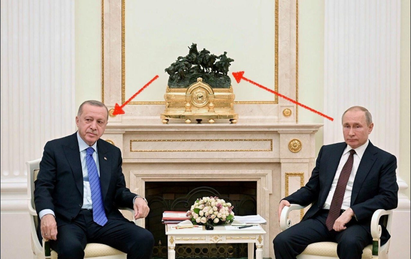 В российском сегменте соцсетей активно обсуждают забавное совпадение на фотографиях с переговоров Владимира Путина и Реджепа Тайипа Эрдогана, которые состоялись накануне в Кремле.