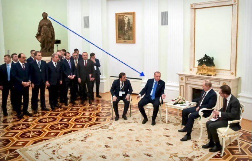 Также в комнате, где состоялась встреча Путина и Эрдогана, стояла статуя Екатерины Великой, которая в свое время отвоевала у Османской империи Крым. Статуя императрицы находилась прямо за спинами членов турецкой делегации.