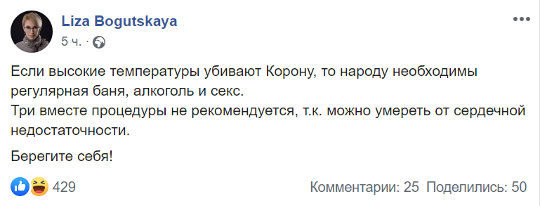 «Если высокие температуры убивают Корону (коронавирус — ред.), то народу необходимы регулярная баня, алкоголь и секс», — написала она.
