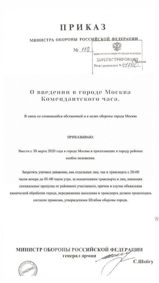 В опубликованном документе датой введения комендантского часа указано 30 марта - ближайший понедельник. В опубликованном журналистом приказе сообщается, что в Москве будет запрещено уличное движение не только отдельных лиц, но и транспорта, начиная с 20:00. Комендантский час будет длиться до 5:00 за исключением транспорта и лиц, которые имеют специальные пропуска.