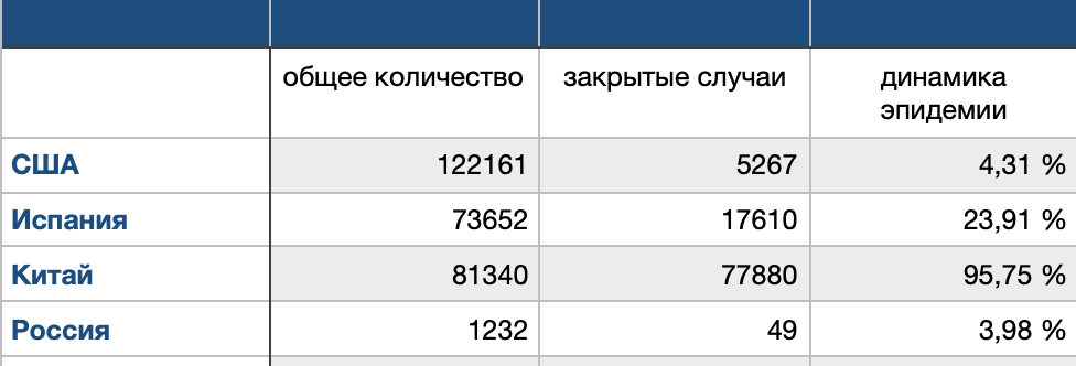 Вывод из трех полученных значений вполне очевиден: в Китае эпидемия завершена, в Испании она на полпути к пику, в США всё только начинается.