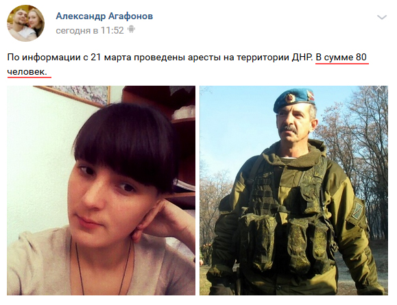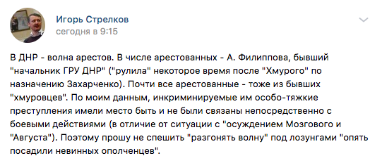 В числе арестованных - А. Филиппова, бывший "начальник ГРУ ДНР" ("рулила" некоторое время после "Хмурого" по назначению Захарченко). Почти все арестованные - тоже из бывших "хмуровцев"" - написал Стрелков.