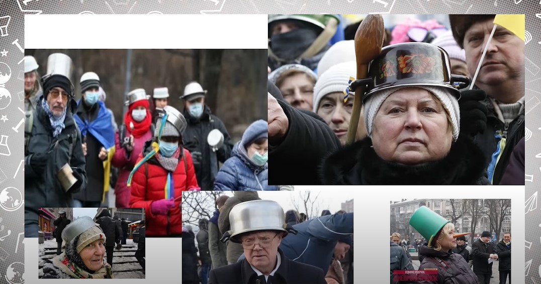С 6 апреля в Украине транслируются уроки для школьников, вынужденных оставаться дома во время карантина. На уроке истории Украины для пятого класса учитель Элла Сытник надела на голову кастрюлю, изображая участников вече Евромайдана.