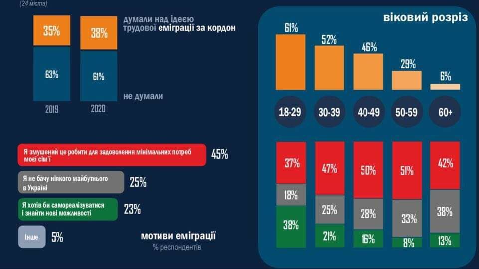 Вместе с тем специалист приводит результаты опроса социологической группы «Рейтинг», которые свидетельствуют о том, что в Украине 61% молодежи в возрасте от 18 до 29 лет хотели бы поехать на работу зарубеж. Среди тех, кому от 30 до 49 лет, таких – 51%.