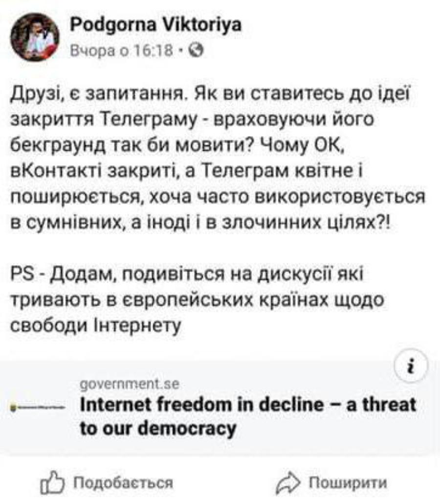По ее словам Телеграм сегодня используется в преступных целях, а вопрос свободы интернета вообще спорный.