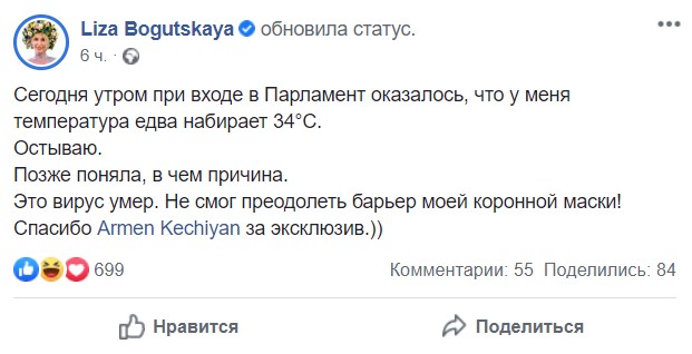 “Андрей Ермак творит чудеса. Депутат Лиза Богуцкая так испугалась звонка от него, что маску-авоську убрала”, — отреагировал на своей странице журналист.