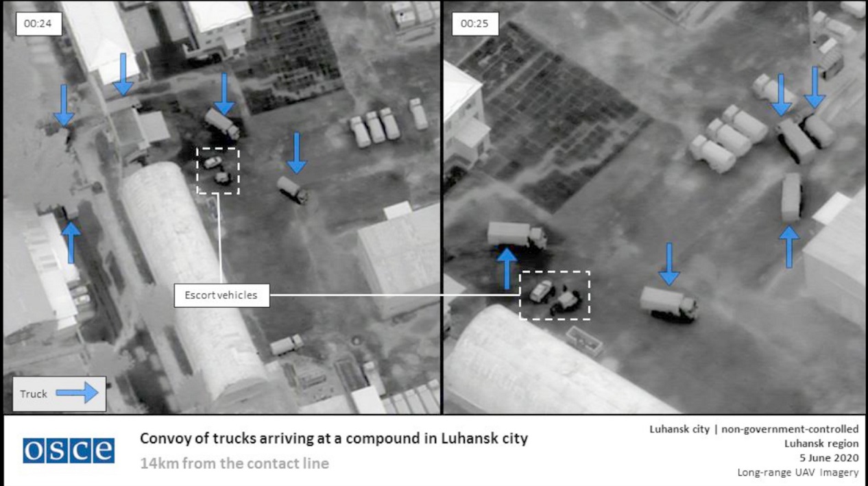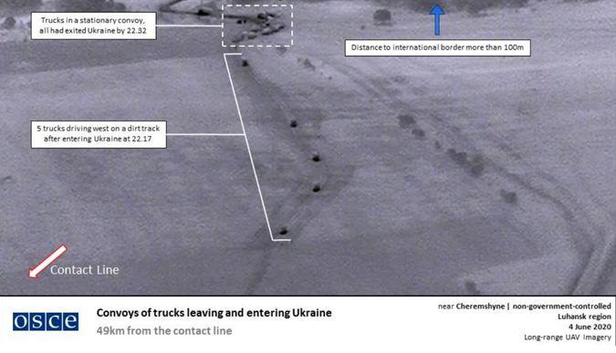Скрытный проезд автоколонны грузовиков на территорию Украины в неподконтрольном районе Луганской области вблизи границы с Российской Федерацией в местах, не оборудованных системой пропуска, был зафиксирован в ежедневном отчете СММ ОБСЕ от 6 июня 2020 года.