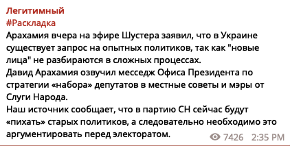 "Давид Арахамия озвучил месседж Офиса Президента по стратегии "набора" депутатов в местные советы и мэры от "Слуги Народа". Наш источник сообщает, что в партию СН сейчас будут "пихать" старых политиков, а следовательно, необходимо это аргументировать перед электоратом", - сообщил ресурс.