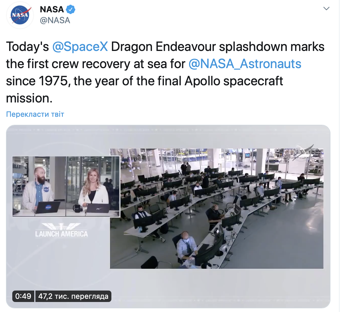Пилотируемый космический корабль Crew Dragon компании SpaceX, главой которой является Илон Маск, успешно вернулся на Землю из своего первого пилотируемого полета. Об этом сообщает пресс-служба NASA в Twitter.