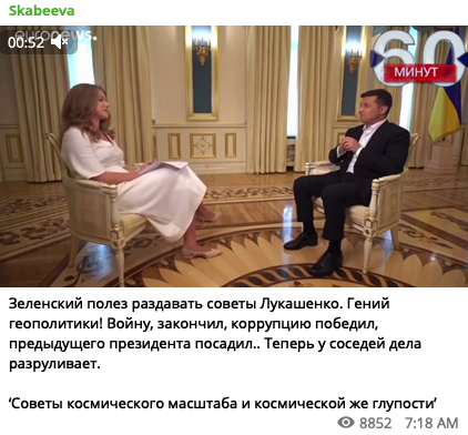 Его слова не понравились российской ведущей Ольге Скабеевой. Лояльная к Кремлю журналистка разразилась оскорблениями в адрес Зеленского на своем канале в Telegram.