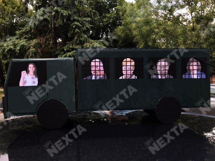 К посольству Беларуси в Париже принесли макет автозака, за зарешечеными окнами которого видны лица Лукашенко и белорусских чиновников, а за рулем – Светлана Тихановская