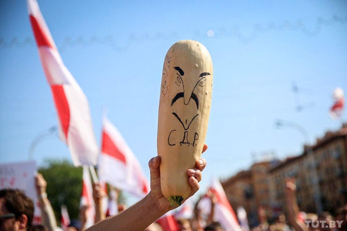 Участники акций 30 сентября несли не только бело-красно-белые флаги и лозунги, но и подарки для диктатора. Среди них было много тыкв, которые оставили возле президентской резиденции девушки.