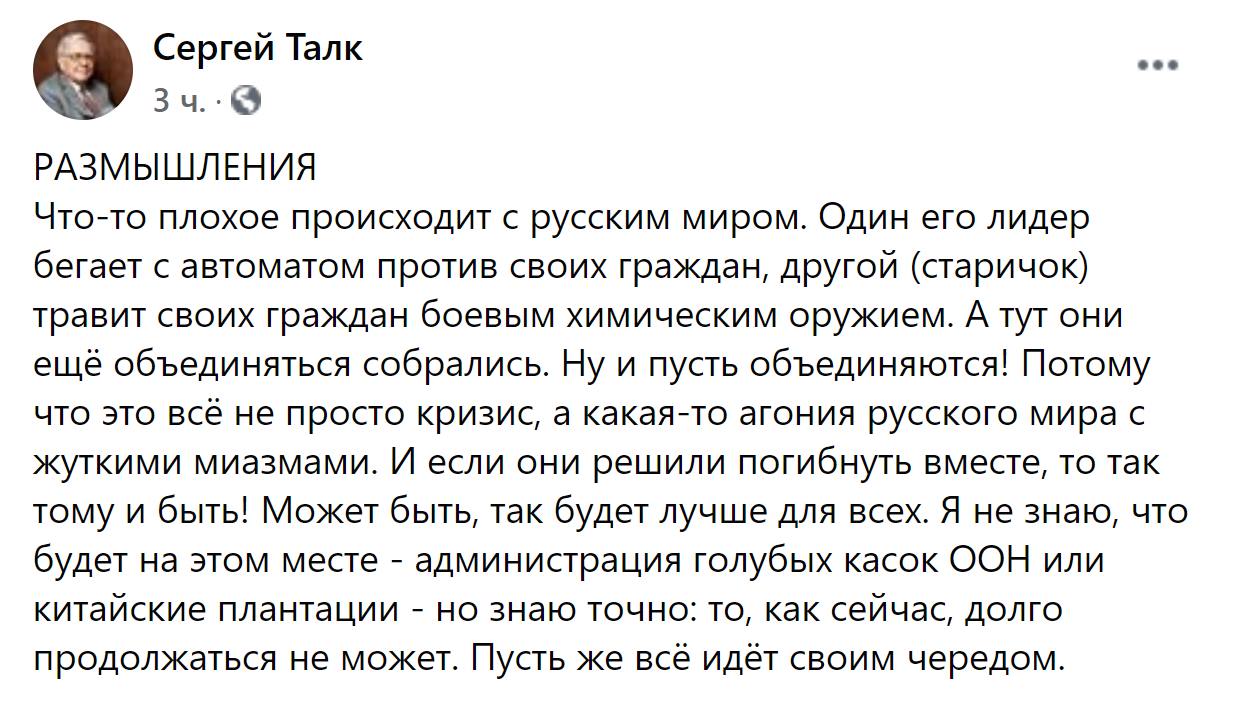 В любом из сценариев речь пойдет о "недружественном поглощении" - с банкротами никто в здравом уме никаких равноправных отношений не строит. Здесь важно понимать, что интерес Кремля здесь тоже более чем очевиден - путинская Россия в целом тоже банкрот, но продлить агонию режима технически возможно - и как раз через поглощение чужих ресурсов.