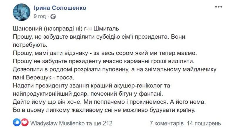 Пользователь Ирина Солошенко предложила выделить субсидию семье президента, дать его матери отдельную награду и выделять Владимиру Зеленскому «карманные деньги».