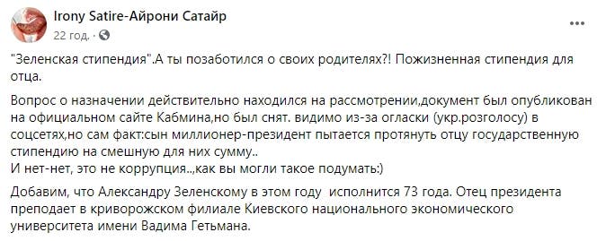 «А сегодня уже пошли заявления о трудовых коллективах, которые обращались, чтобы наградить отца Зеленского пожизненной стипендией. Трудовые коллективы, господа. Это какой-то СССР? И признайте, что облажались с этим решением. Но нет …», — отметил он.