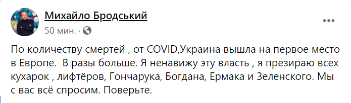 "По количеству смертей от COVID Украина вышла на первое место в Европе. В разы больше. Я ненавижу эту власть, я презираю всех кухарок, лифтеров, Гончарука, Богдана, Ермака и Зеленского. Мы с вас все спросим. Поверьте", - написал он.