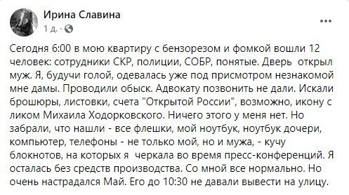 "Искали брошюры, листовки, счета "Открытой России", возможно, икону с ликом Михаила Ходорковского. Ничего этого у меня нет. Но забрали, что нашли – все флешки, мой ноутбук, ноутбук дочери, компьютер, телефоны – не только мой, но и мужа, – кучу блокнотов, на которых я черкала во время пресс-конференций. Я осталась без средств производства", – написала Славина.