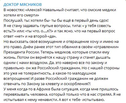 Слово "отравление" Мясников взял в кавычки и написал, что испытывает к Навальному ненависть.