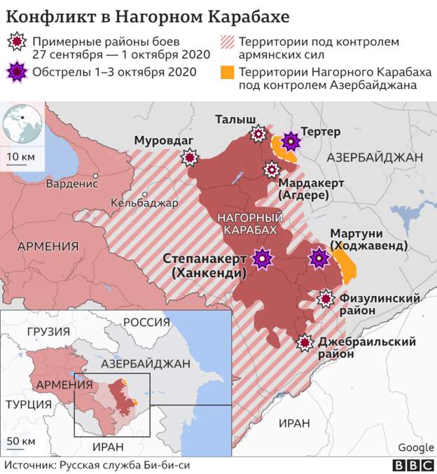 На карте карабахского конфликта показали текущую ситуацию по состоянию на 3 октября. Как видно по размещению войск и линии фронта, азербайджанская армия идет в наступление.