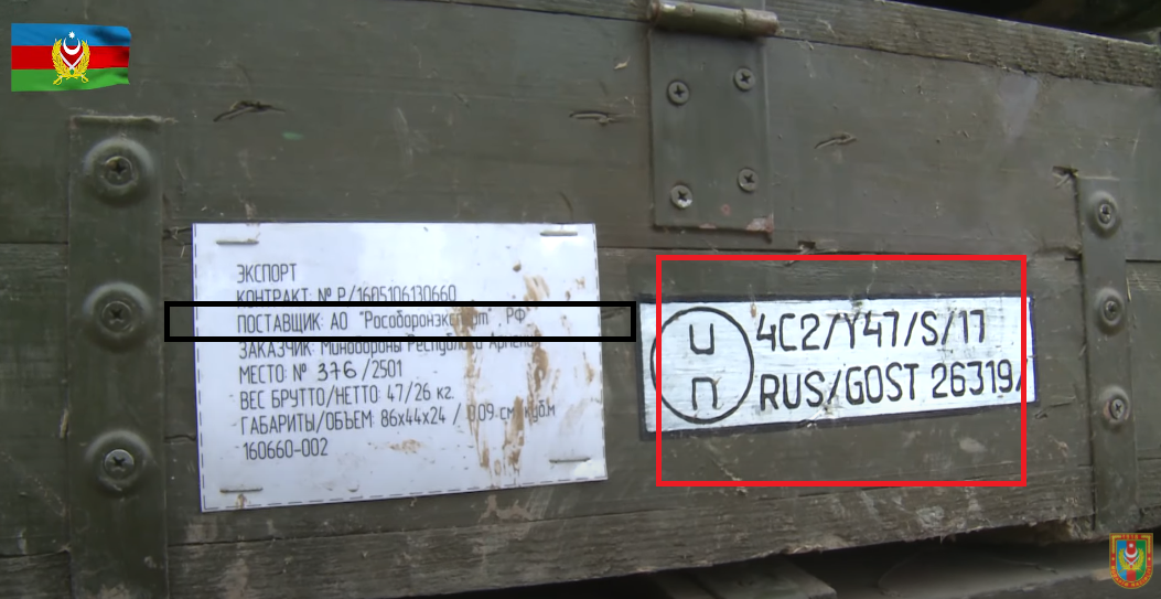 При этом маркировка ящиков с оружием указывает на происхождение оружия, которое было доставлено в Нагорный Карабах АО "Рособоронэкспорт". Российская компания на ящиках с оружием отмечена как "официальный поставщик". На ящиках с оружием также маркировка российских гостов.