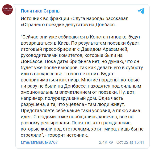 По результатам поездки они анонсировали итоговый пресс-брифинг с Давидом Арахамией и руководителями комитетов, которые были на Донбассе.