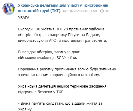 С начала текущих суток, 30 октября, вооруженные формирования РФ два раза нарушили режим прекращения огня.
