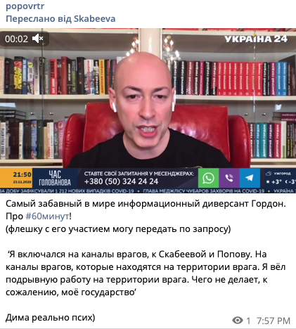 "Я включался на каналы врагов, к Скабеевой и Попову. На каналы врагов, которые находятся на территории врага. Я вел подрывную работу на территории врага, чего не делает, к сожалению, мое государство", - сказал Гордон.