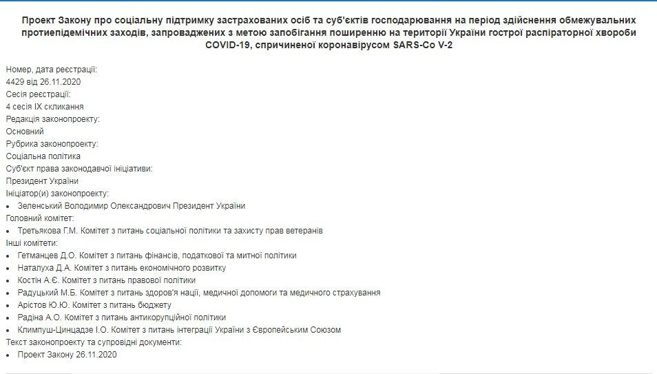 Называется проект закона "О социальной поддержке застрахованных лиц и субъектов хозяйствования на период действия ограничительных противоэпидемических мер, введенных с целью предотвращения распространения в Украине острой респираторной болезни COVID-19, вызванной коронавирусом SARS-Co V-2".