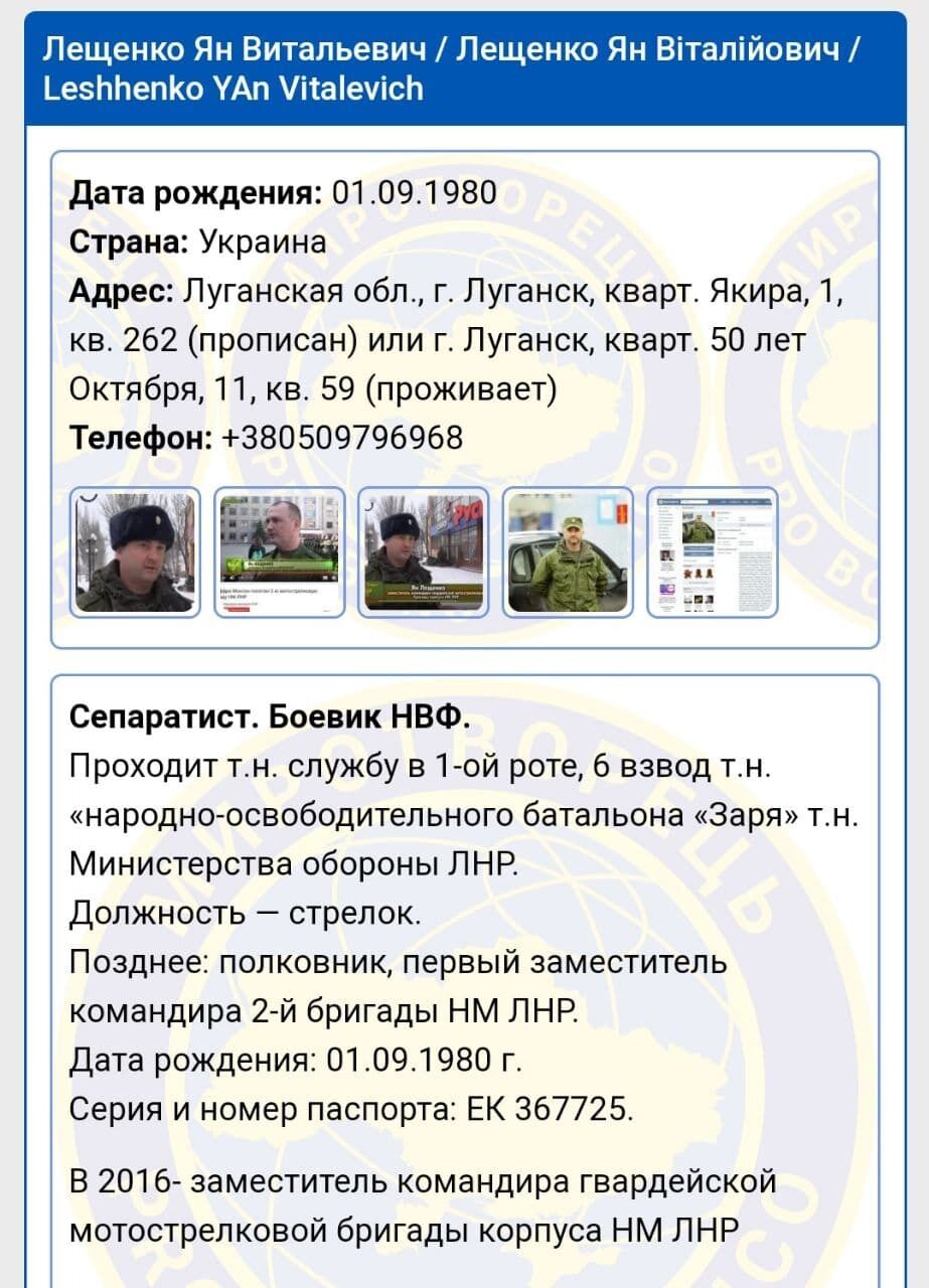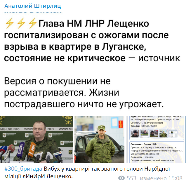 "300 бригада. Взрыв в квартире "главы нарядной милиции ЛНР" Лещенко", – написал он. Защитник также напомнил, что оккупант внесен в базу военных преступников на сайте "Миротворец".