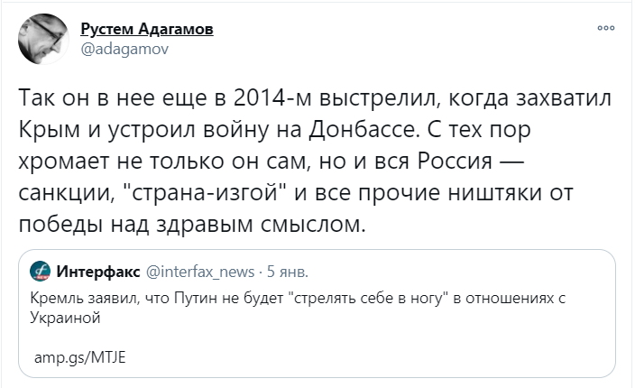 "Так он в нее еще в 2014-м выстрелил, когда захватил Крым и устроил войну на Донбассе. С тех пор хромает не только он сам, но и вся Россия — санкции, "страна-изгой" и все прочие ништяки от победы над здравым смыслом", - написал Адагамов на своей странице в социальной сети.