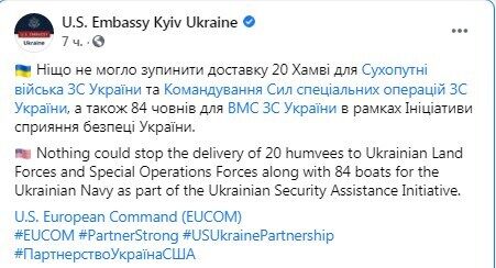 "Ничто не могло остановить доставку 20 "Хамви" для Сухопутных войск и командования Сил специальных операций, а также 84 лодки для ВМС в рамках инициативы содействия безопасности Украины", – сказано в сообщении.
