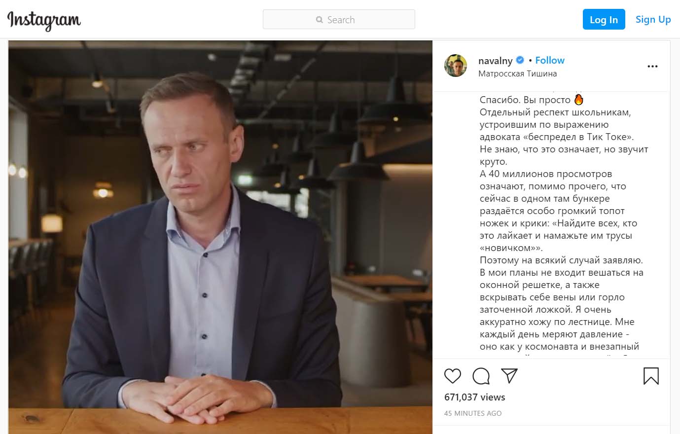 «А 40 миллионов просмотров (на момент публикации новости уже более 57 млн) означают, помимо прочего, что сейчас в одном там бункере раздаётся особо громкий топот ножек и крики: «Найдите всех, кто это лайкает и намажьте им трусы «новичком»». Поэтому на всякий случай заявляю. В мои планы не входит вешаться на оконной решетке, а также вскрывать себе вены или горло заточенной ложкой. Я очень аккуратно хожу по лестнице. Мне каждый день меряют давление — оно как у космонавта и внезапный сердечный приступ исключён. Я не пью самогон и не объедаюсь рафаэлками», — написал он.