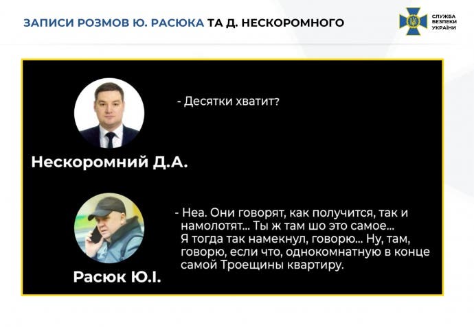 На второй записи содержится разговора Расюка и Нескоромного, в ходе которого они обсуждают, сколько денег потребуется для «дела».