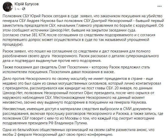 «Дело против Нескоромного по своему масштабу не имеет прецедентов в стране — еще недавно это был один из самых могущественных силовиков, который лично контактировал с президентом, рассматривался как кандидат на пост главы СБУ. 20 января, по данным Цензор.Нет, полковник Нескоромный посетил Офис президента, после чего скрылся от наружного наблюдения СБУ. Местонахождение Нескоромного на данный момент неизвестно, заочно ему выдвинуто подозрение в покушении на генерала Наумова», — пишет журналист.