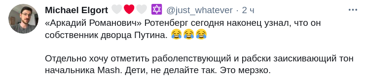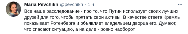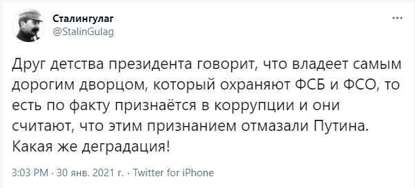 "Друг детства президента говорит, что владеет самым дорогим дворцом, который охраняют ФСБ и ФСО, то есть по факту признаётся в коррупции и они считают, что этим признанием отмазали Путина. Какая же деградация!" - возмущается пользователь сойсети под ником Сталингулаг.