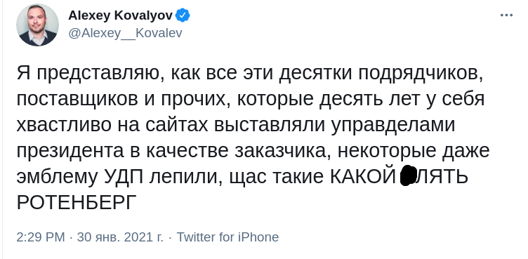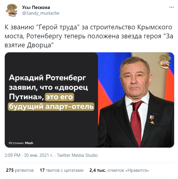 "К званию "Герой труда" за строительство Крымского моста, Ротенбергу теперь положена звезда героя "За взятие Дворца", - пишут в Twitter "Усы Пескова".