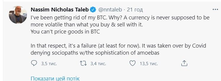 "Я избавляюсь от своих биткоинов. Почему? Валюта никогда не должна быть более изменчивой, чем то, что вы покупаете и продаете за нее. Вы не можете оценивать товары в биткоинах. В этом отношении это провал (по крайней мере, пока). Его захватил Ковид, который отрицает социопатов с изощренностью амеб", – написал экономист.
