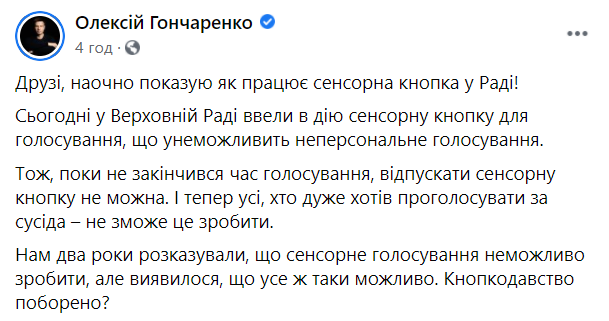 “После первых попыток голосования сенсорной кнопкой можно уверенно сделать вывод, что такая кнопка предотвращает: 1) неперсональное голосование; 2) голосование за президентские законопроекты. В принципе, и первое и второе ок”, – написал он в Facebook, вероятно, подразумевая то, что сегодня не сразу удавалось включить в повестку дня президентские законопроекты о налоговой амнистии.