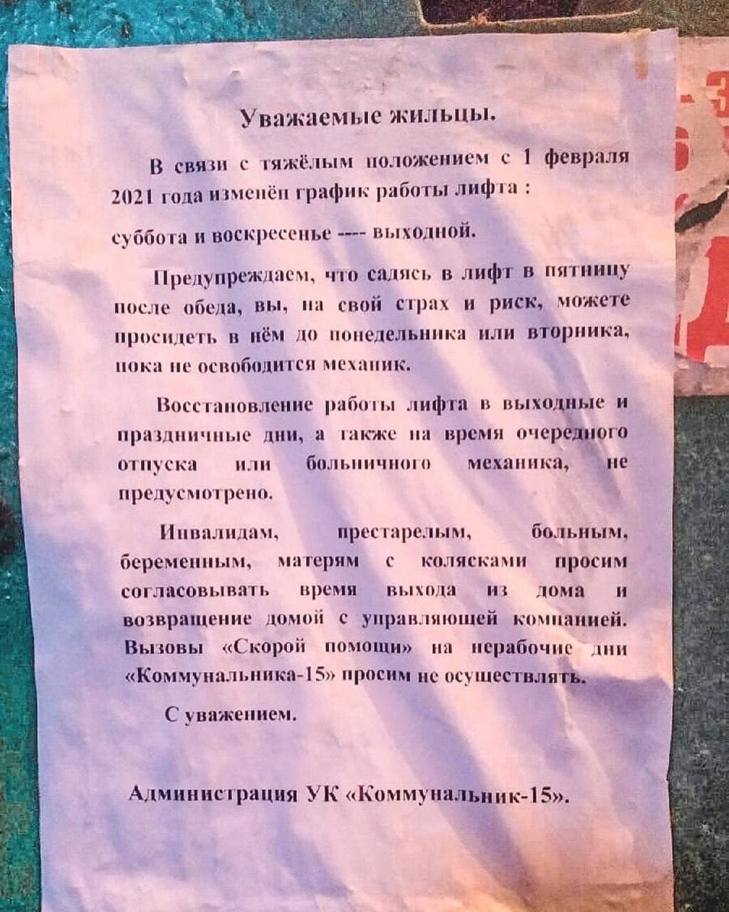 В объявлении жителей дома предупреждают: если они сядут в лифт в пятницу после обеда, то должны понимать, что в случае поломки их освободят только в понедельник-вторник, когда освободится механик. В выходные и праздничные дни, а также во время отпуска и больничного механика восстановлением лифта заниматься некому.