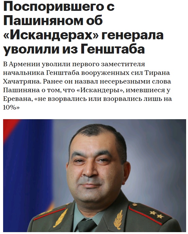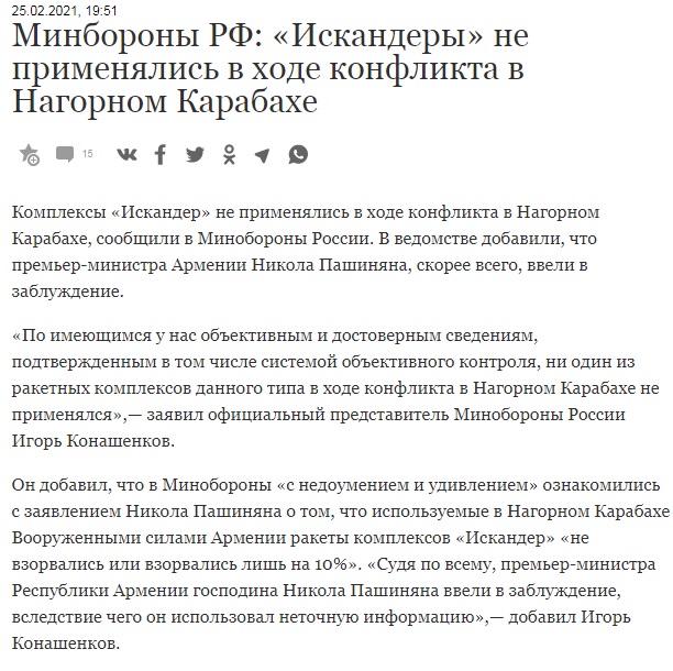 В общем, алгоритм такой… Пашинян раскрыл низкую эффективность ОТРК Искандер, за что его высмеяли в МО Армении, а в МО РФ и вовсе заявили, что ОТРК Искандер в Нагорном Карабахе не применялся.