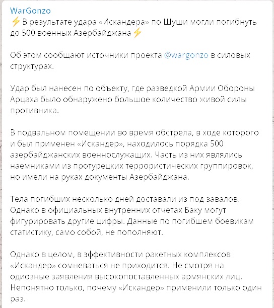 Мол, ракетой 9М723 в подвале дома в Шуше (см. фото) было уничтожено (ВНИМАНИЕ!) 500 военных армии Азербайджана, многие из которых были турецкими наёмниками... Ох уж эти излюбленные истории про разного рода наёмников в армиях противостоящей стороны.