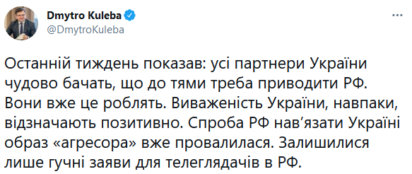 В свою очередь, Кулеба написал в Twitter, что "последняя неделя показала: все партнеры Украина прекрасно видят, что в себя надо приводить РФ".