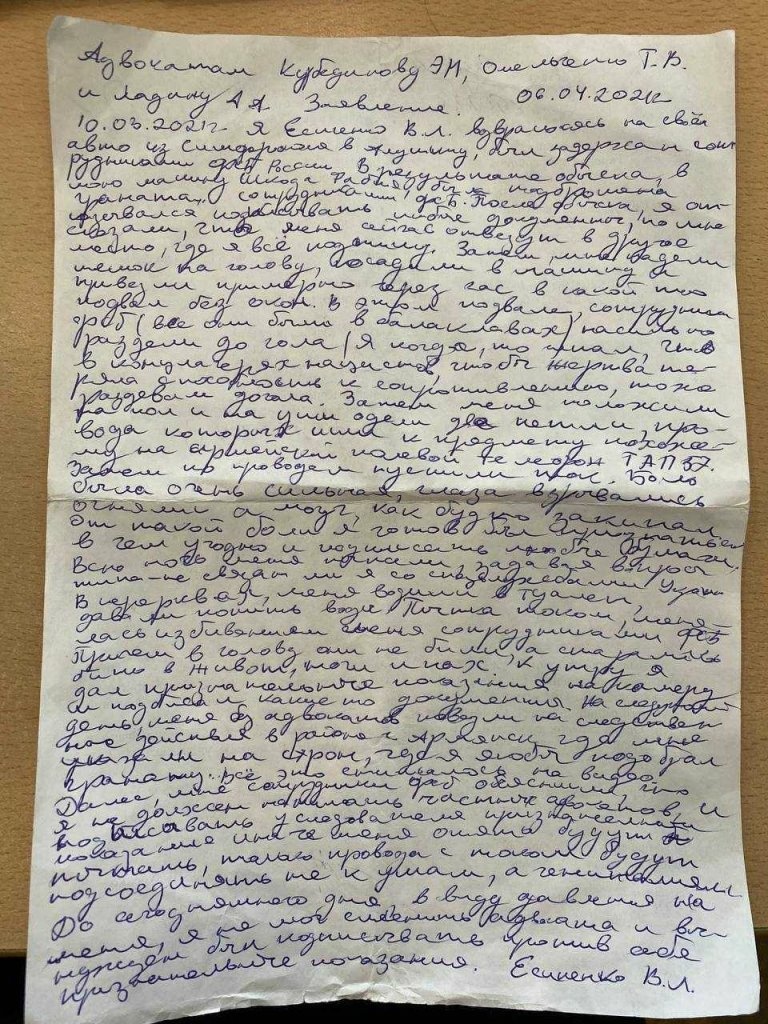 В распоряжении "Ґрат" есть письмо, написанное Есипенко. В нем журналист сообщил подробности задержания. По его словам, российские силовики подбросили в машину гранату. После обыска Есипенко отвезли в подвал.